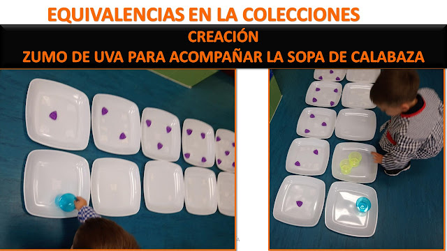 Le toca el turno a las equivalencias entre colecciones. La creacción de colecciones parte de la elaboración de zumo de uva para acompañar a la sopa de calabaza ya que es otra fruta característica de esta época del año. Cada ración de uvas que va a ser exprimido, necesita un vaso para poder beberlo: