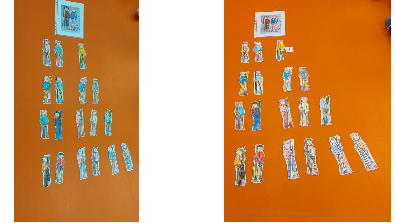 Utilizando como recurso los esquís que aparecen en el cuadro, contamos de dos en dos depresores que representan los esquís que necesitaríamos para que todos y todas en la clase tuviésemos esquís. A continuación, representamos simbólicamente la cantidad resultante.