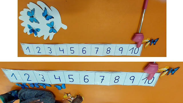 Para terminar esta actividad todos nos colocamos en la recta numérica, eligiendo cada uno su grafía. Hacemos retrocuenta desde el 5 para levantar y comprobar los huevos que hemos encontrado.